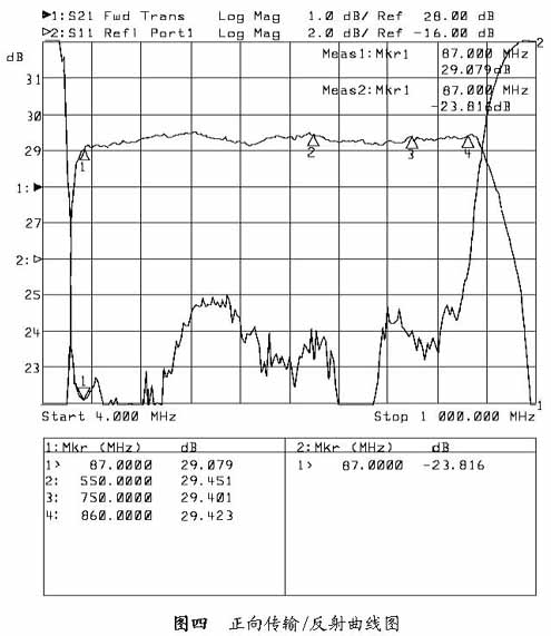 此款双向放大器中选用的模块是采用管芯工艺的放大器模块——KF888C和KR67AC。除了可靠性、稳定性较高外,它的“射频特性”和“传输模式”也较为优秀。当然如果改用进口PHILIPS或MOTOROLA的模块指标也会有一些提高,可以用于要求较高的网络中。图四是采用“惠普”网络分析仪,对本文介绍的这款860MHz双向放大器的正向传输/输入反射的测试指标。从仪器上反映出来的带内平坦度优于±0.4dB;输入反射优于-16dB;下行87MHz—860MHz。非线性失真指标采用自产60路信号源、惠普HP8591C频普分析仪测试(实际送入60路信号),当输出电平为106dB时,22频道的CTB指标为63.8dB,CSO指标为64.6dB。最大输出电平采用国产3路信号源、惠普HP8591C频普分析仪测试,输入的三路信号频率为735.25MHz、743.25 MHz、745.25 MHz,最大输出电平为120.5dB 。当三路信号源的频率变为847.25MHz、855.25MHz、857.25MHz时,最大输出电平则降为119.3dB